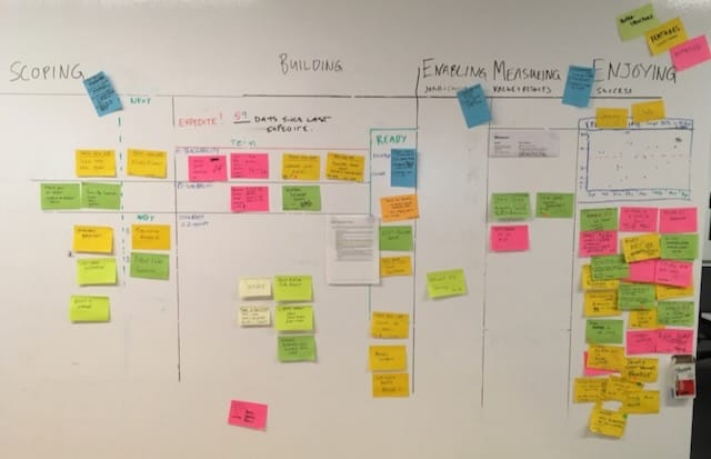 When I was at Jama Software, a B2B SaaS startup in Portland, Oregon, we had just moved into a new building, thoughtfully designed with an enormous whiteboard wall and open area right between the desks for product and engineering. This wall was a natural place to start building a visualization.