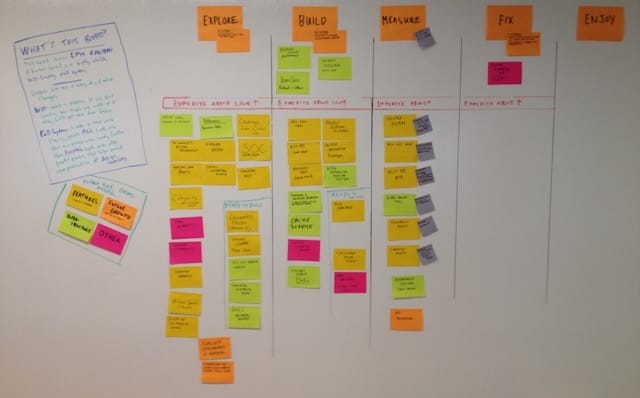 I started out by inviting each PM to walk to the wall with me, one at a time, over a week or so. I asked them what features they were working on, and wrote them on stickies. We started out with a simple flow - Explore, Build, Measure, Fix, and Enjoy: